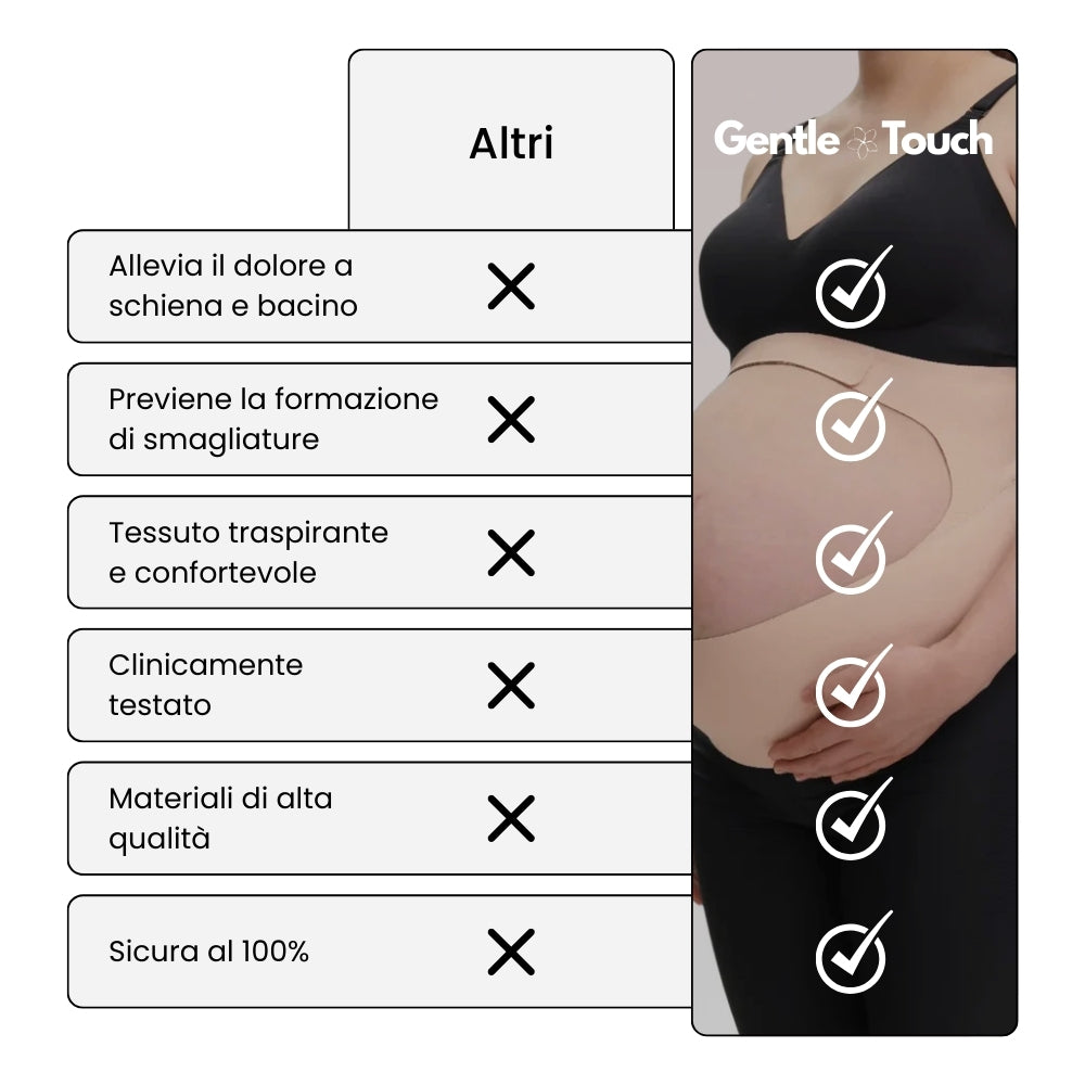 Funziona distribuendo in modo uniforme il peso della pancia sulla schiena e sul bacino, offrendo supporto ai muscoli, migliorando la postura e riducendo la pressione che causa dolori e affaticamento.